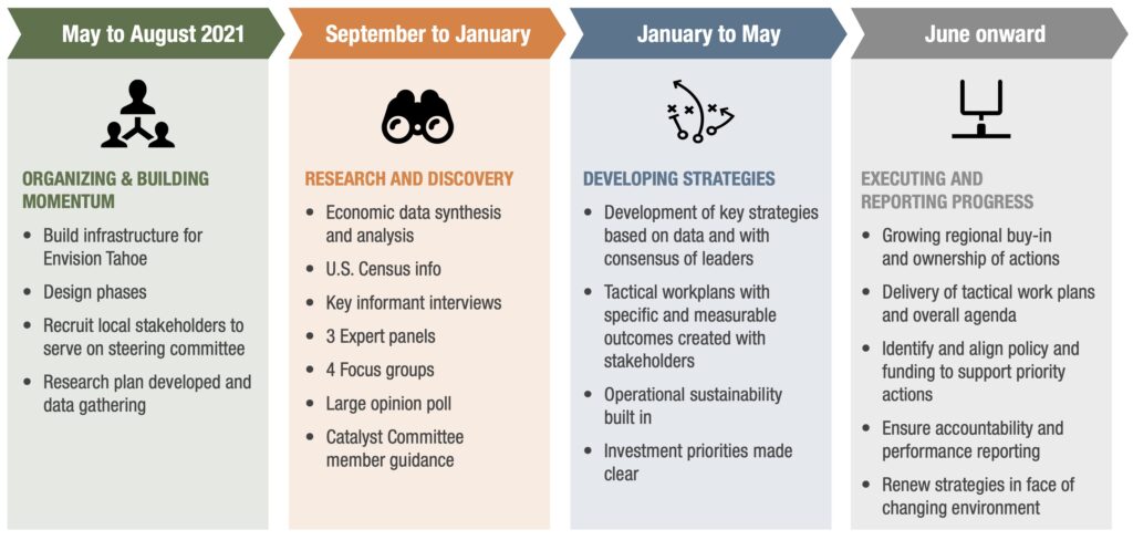 Envision Tahoe was a 12-month economic initiative organized by the Tahoe Prosperity Center, guided by a regionally representative Catalyst Committee, and underwritten by the U.S. Economic Development Administration to create an economic recovery and resiliency strategy for the Tahoe Basin emphasizing economic diversification.